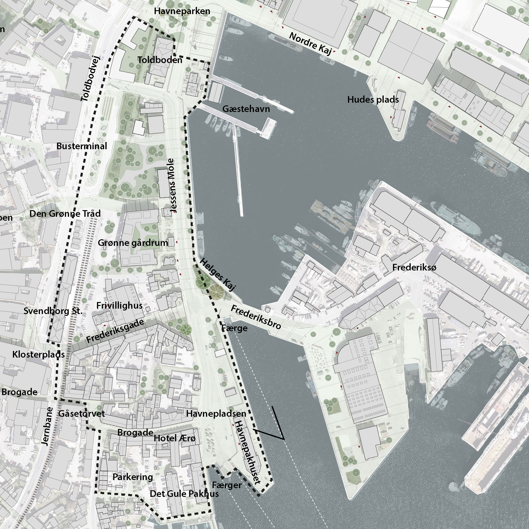Tilføjelsen af Geohavneparken styrker muligheden for rekreativt byliv tæt på kajkanten og skaber forbindelse til den østlige del af havnen. Særligt Frederiksgade og Havnetrappen sikrer stærke forbindelser mellem by og havn. På Havnepladsen afvikles en del trafik, men der er også muligheder for ophold og færdsel for bløde trafikanter - og udsigt til øhavet.